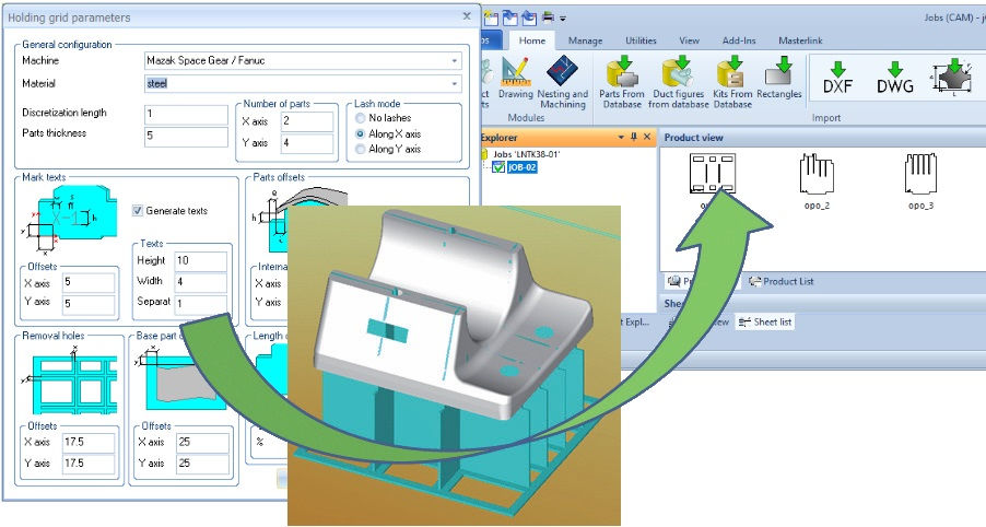 Lantek Flex3d 5x автоматически генерирует фиксирующие приспособления, необходимые для правильного позиционирования детали на столе станка. Принимая за основу желаемое положение и высоту детали над столом, система генерирует поддерживающую решетку для нее, где пользователь может определять число удерживающих деталь приспособлений, а также их местоположение.При автоматическом расчете приспособлений учитываются контуры резки, поэтому рассчитанные приспособления не мешают ни режущей головке, ни каким-либо отверстиям, которые нужно вырезать. Это экономит ценное машинное время, обычно связанное с проверкой программы на машине.
