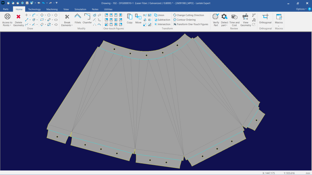 2D проектирование. Lantek Expert Duct интегрирован c 2D CAD модуль для проектирования любых деталей, а также модификации геометрии контуров. Затем плоский шаблон может быть вырезан лазером/плазмой или высечен на координатном прессе в Lantek Expert принимая в расчет фланцы, выемки и маркировку линий гибки,