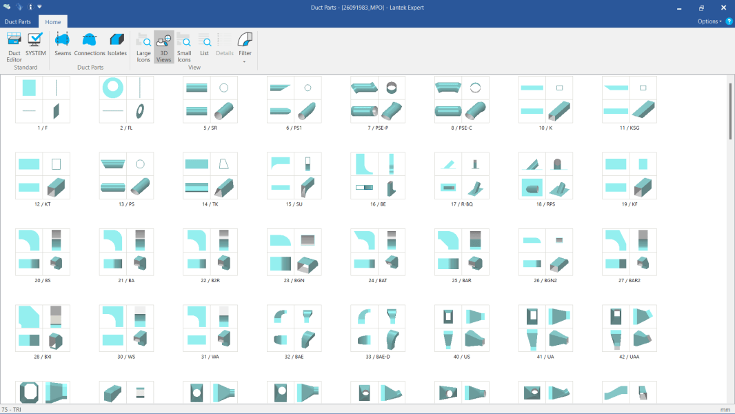 Lantek Expert Duct разработан таким образом, что пользователю нужно только только выполнить простые шаги, предложенные системой. Lantek Expert Duct включает в себя полную библиотеку параметрических деталей, которые также соответствуют нормам DIN и SMACNA (квадратные, круглые, конусные, цилиндрические, фигуры для изготовления котлов, пересечения труб и т. д.) и покрывают большинство доступных форм воздуховодов.