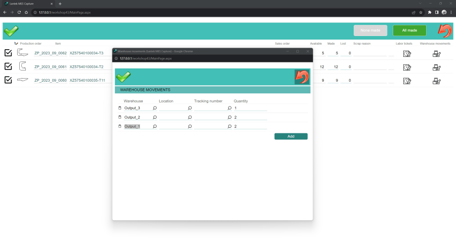 Существует два способа передачи информации и определения пользователя, который должен начать работу в рабочем цеху: можно использовать сенсорный экран (где выполняемая или выполненная работа может быть введена вручную), либо с использованием считывателя штрих-кодов. Таким образом, данные легко собираются со всей площади завода, не вызывая ошибок или простоев.