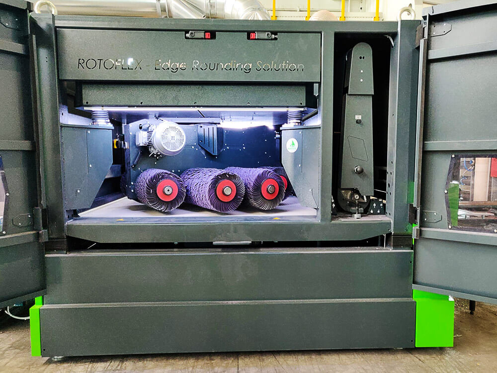 Мощный модуль, который есть только у станка EMC Rotoflex. Позволяет проводить операции удаления грата, окалины и оксидной пленки, снятия заусенцев, шлифовки, скругления кромок до 2 мм и более за один проход. |